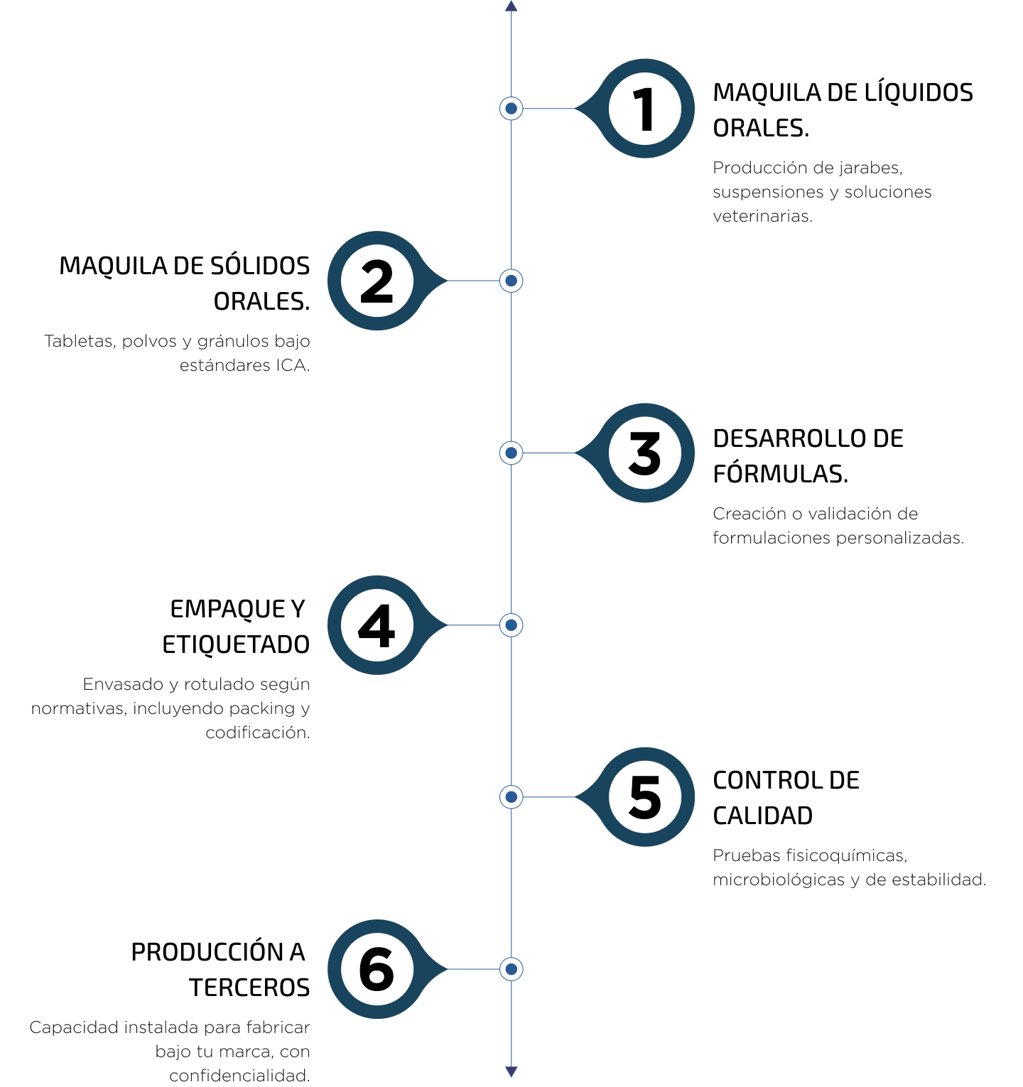 Ofrecemos un portafolio integral de servicios de maquila para productos farmacéuticos veterinarios, con respaldo técnico, procesos certificados y absoluta confidencialidad. Nos adaptamos a tus necesidades desde la formulación hasta la entrega final.